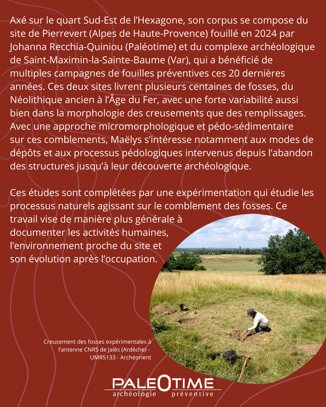 Rencontrons à présent Maëlys Cizeron qui travaille sur les comblements des fosses pour les périodes du Néolithique et de la Protohistoire, avec une approche géoarchéologique et expérimentale.